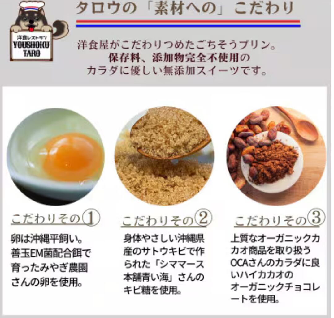 ・化学調味料不使用 ・与那原町特産品として認定されました EM卵やきび砂糖など沖縄県産食材を使用。お子様からお年寄りまで安心してお召し上がりいただけるこだわりの無添加プリンです。